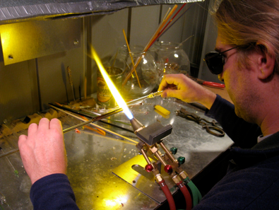 Eric Dalmata is the owner and artist of Rabbit Shack Glass. Eric began working with glass in 1994, and received his formal training from the New York State College of Ceramics, School of Art and Design, at Alfred University. Since then, Eric has been working with other glass artists within the Colorado Front Range and has been continuing his training throughout all aspects of the medium including traditionally blown glass from the furnace, torch worked borosilicate, casted, fused, and stained glass.